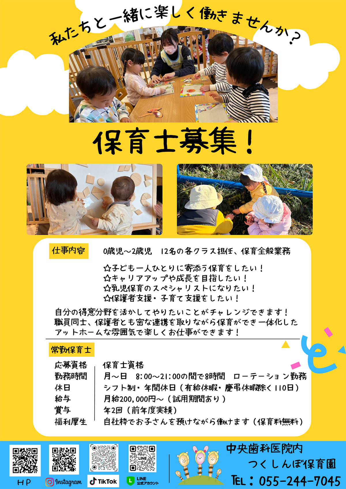甲府市の市街地にある小さな保育園ですが、地域の四季折々の風景や事柄を体感できるような保育活動を日常保育に組み込みながら、小規模保育園ならではのゆったりのびのびと個々の成長を大事にしながら愛情たっぷりと関わる保育を行っています。「見て・聞いて・触って」全ての感覚で吸収する大切な時期に、ひとつでも多くの経験ができるよう努めています。また、多様な就労形態に対応する保育サービスで、仕事と子育てが両立できるようにサポートし、保護者と共に子育ての楽しみや子どもの成長を喜び合いながら、家族のような存在になれるよう家庭的で温かい保育園を目指しています。